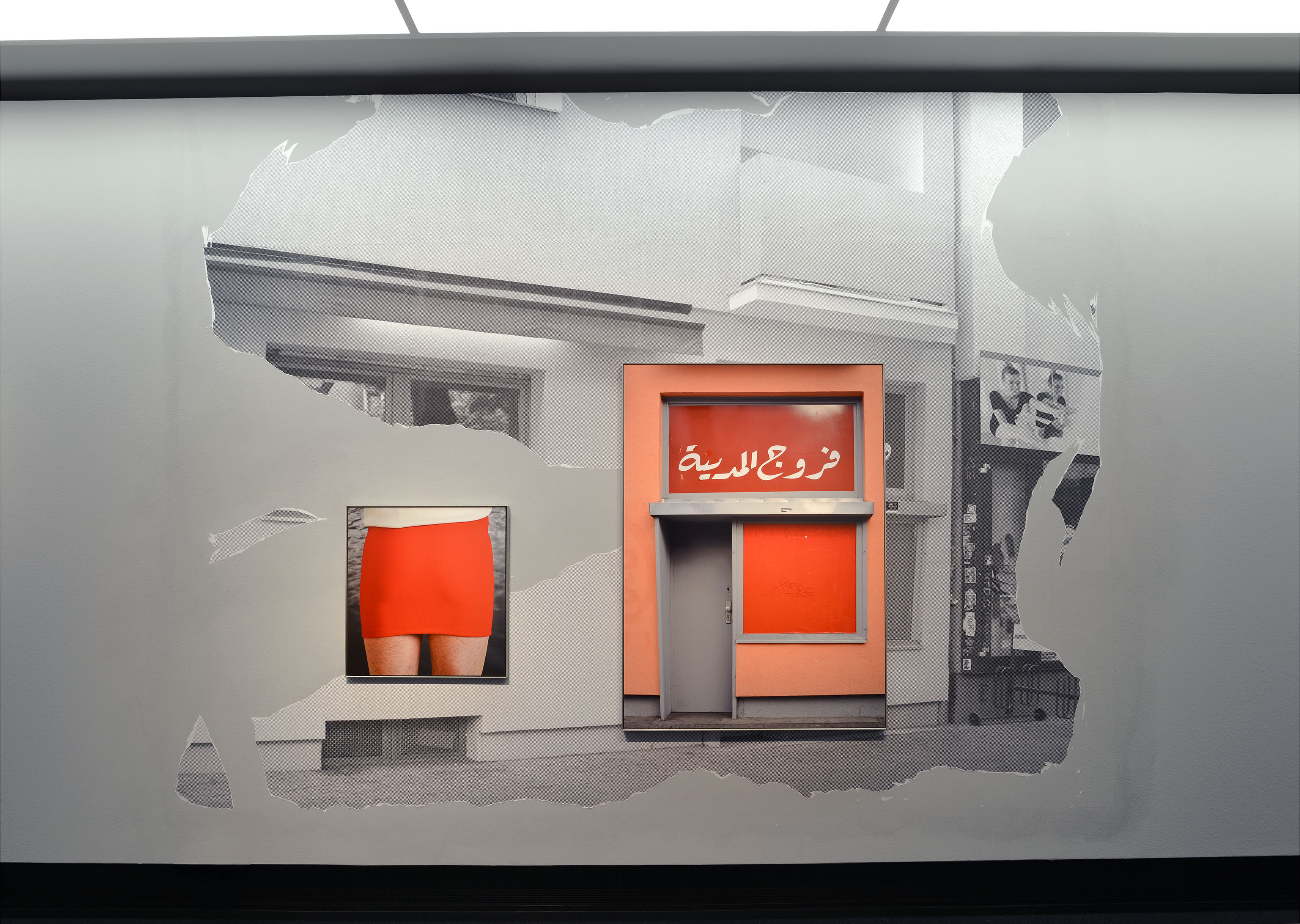 Marriage is a Lie / Fried Chicken, Red Skirt 57x55cm, Marriage is a Lie 123x90cm, iron framed c-prints, wallpaper installation, 2015